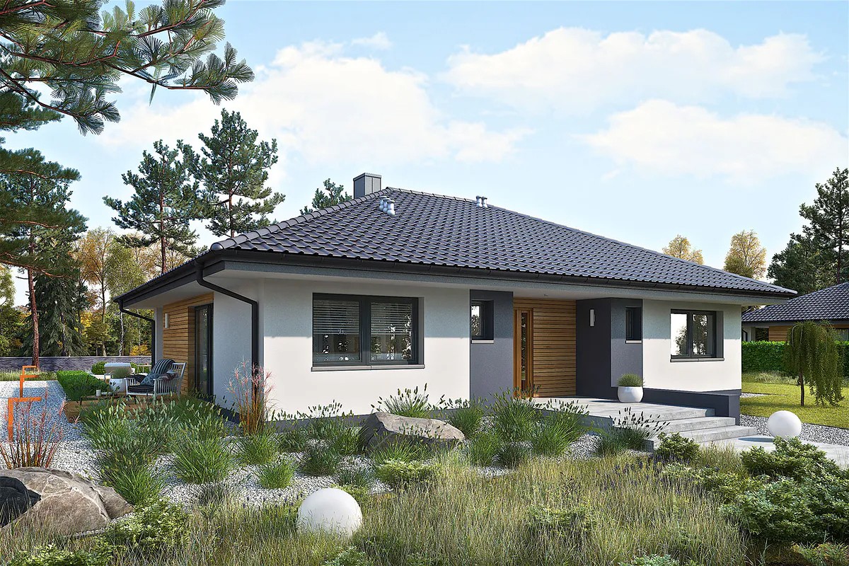 Яркий фасад с деревянными элементами и серыми панелями отлично сочетается с шатровой крышей, покрытой серой металлочерепицей. В задней части дома есть просторная терраса, где вы можете провести время на свежем воздухе со своими близкими.