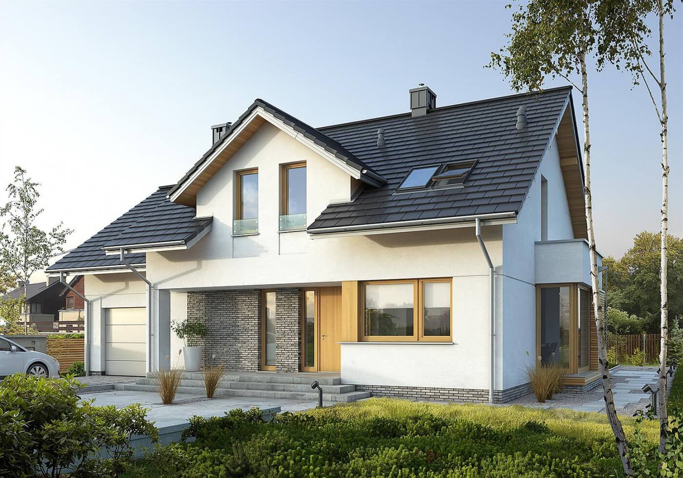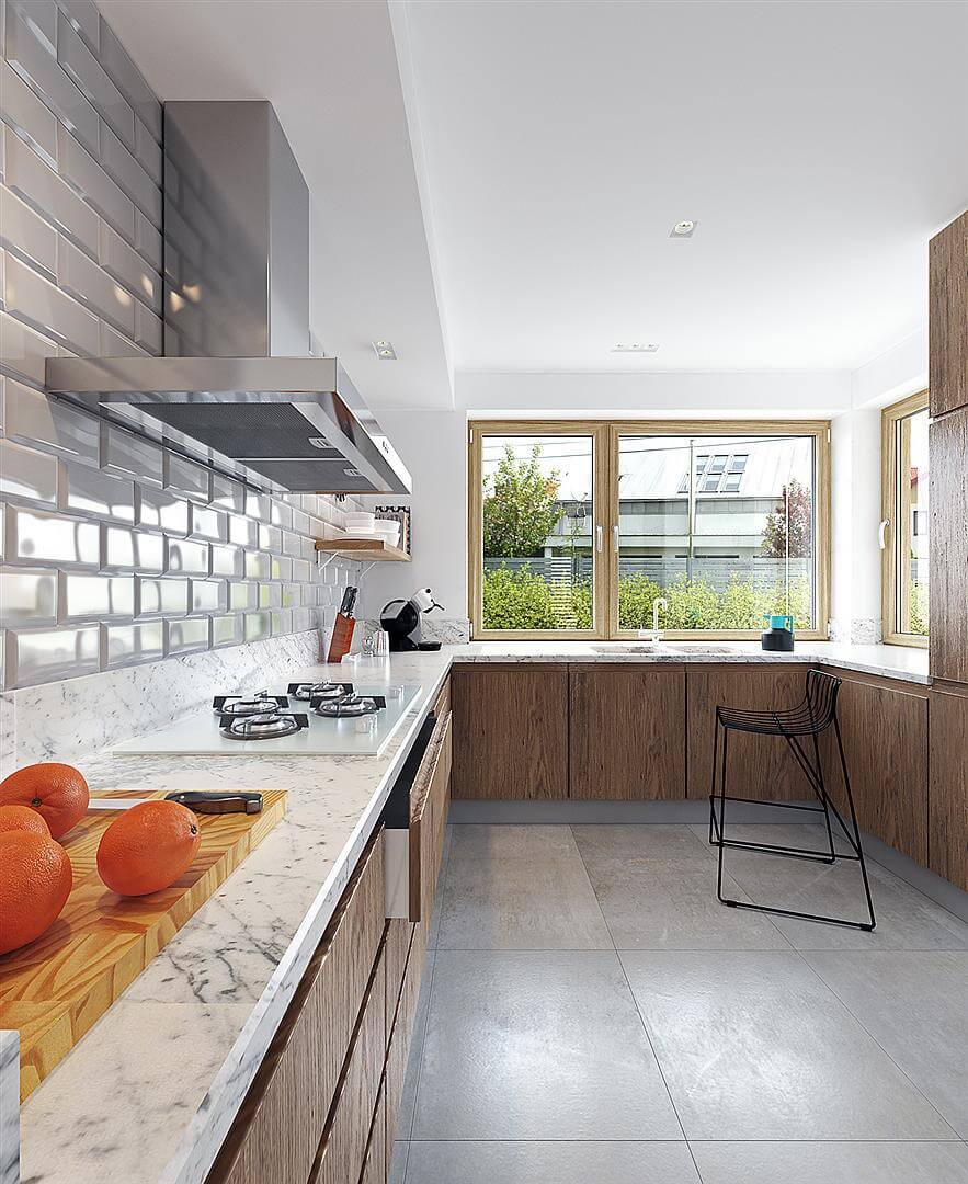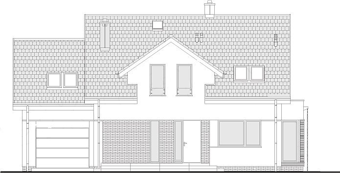 Проект дома "Чикаго", с размерами 10 на 15, подходит для реализации на среднем широком участке. Строительный блок имеет простую форму, что значительно облегчает процесс строительства. Заслуживает внимания декоративный эркер, который придает структуре дополнительный шарм. В этом проекте хребет расположен параллельно дороге, что важно из-за требований, изложенных в плане пространственного развития. Дом был создан для отдельно стоящих зданий. Проект может быть расположен на границе участка, что дает возможность двухквартирного строительства. Проект предусматривает один гараж на линии здания. Проект является идеальным предложением для тех, кто заинтересован в доме с двускатной крышей, который прост и экономичен в реализации. "Чикаго" представляет собой одноэтажный дом с мансардой, что означает, что полезная площадь не ограничена размером участка. Сторонникам просторных пространств наверняка понравится дневная часть, предусмотренная в проекте. Сторонники просторных интерьеров наверняка будут рады, что кухня в дизайне открыта для гостиной. Кроме того, предоставленная кладовая является идеальным местом для хранения консервов и продуктов питания. Дизайнер объединил гостиную и столовую в просторную дневную зону, что является современным и очень функциональным решением. Камин, расположенный в гостиной, сделает интерьер более уютным. На первом этаже есть туалет, а на чердаке архитектор предоставил функциональную ванную комнату. Спальная зона состоит из пяти комнат, который является отличным вариантом для большой семьи. Пространство также может быть использовано в качестве комнаты для гостей или учебы. Комфортное использование дома также зависит от подсобного помещения, включенного в него. Терраса у дома хороша для проведения времени на свежем воздухе. Здание было спроектировано по кирпичной технологии. В его форме есть видимые решения, относящиеся к современному стилю, и в визуальном плане он оправдает даже большие ожидания.