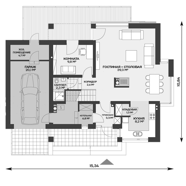 1 этаж 1 прихожая 3,3 м² 2 кладовая 1,3 м² 3 кухня 8,2 м² 4 гостиная + столовая 39,3 м² 5 комната 9,8 м² 6 санузел 2,3 м² 7 коридор 2,6 м² 8 котельная 6,8 м² 9 хоз.помещение 4,7 м² 10 гараж 20,1 м² Всего 98,4 м² |