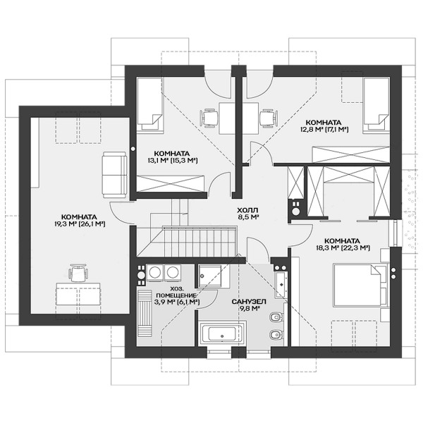 2 этаж 1 холл 8,5 м² 2 комната 15,3 м² 3 комната 17,1 м² 4 комната 22,3 м² 5 санузел 9,8 м² 6 хоз.помещение 6,1 м² 7 комната 26,1 м² Всего 105,2 м² |