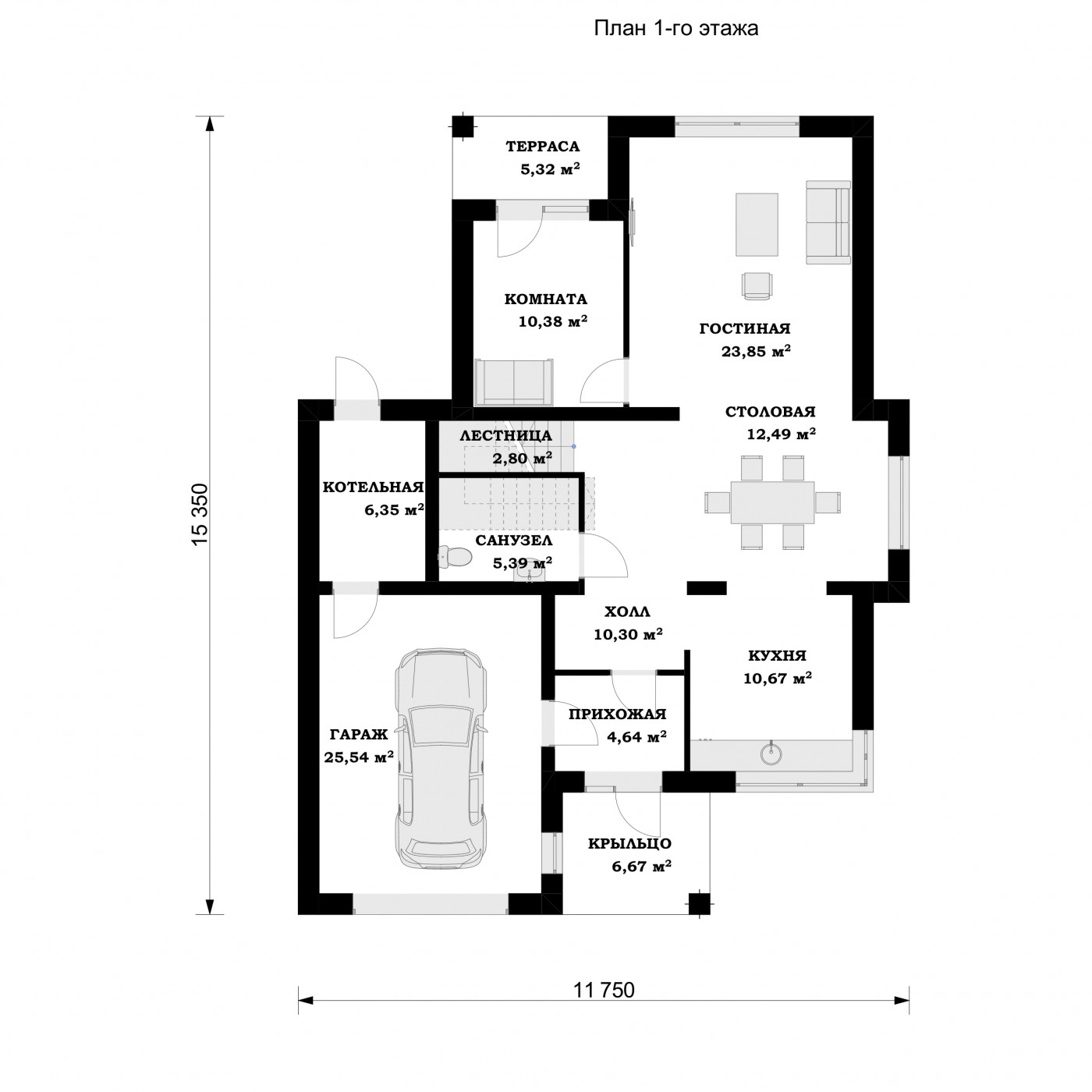 1 этаж 1 прихожая 4,47 м² 2 холл 9,55 м² 3 кухня 10,38 м² 4 столовая 11,35 м² 5 гостиная 22,73 м² 6 комната 10.04 м² 7 лестница 5,16 м² 8 санузел 3,51 м² (4,45 м²) 9 котельная 6,35 м² 10 гараж 23,2 м² Всего 107,68 м² |