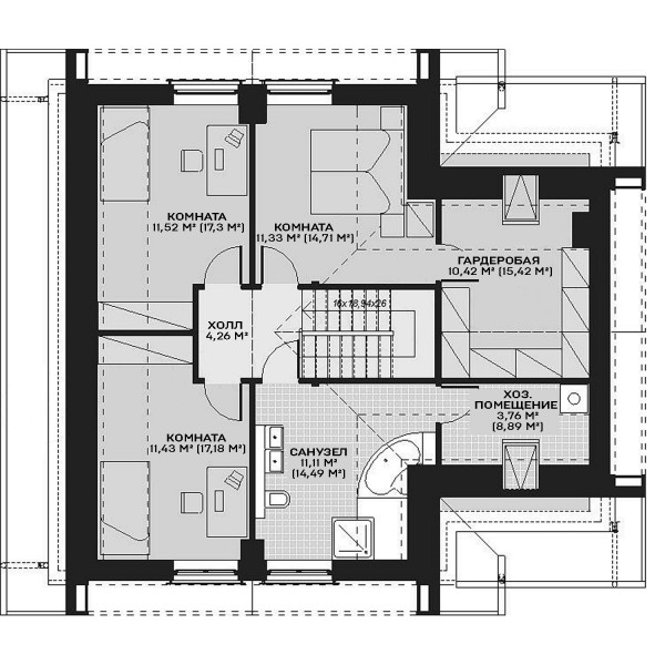 2 этаж 1 холл 4,26 м² 2 комната 17,18 м² 3 комната 17,3 м² 4 комната 14,71 м² 5 санузел 14,49 м² 6 гардеробая 15,42 м² 7 хоз.помещение 8,89 м² Всего 92,25 м² |