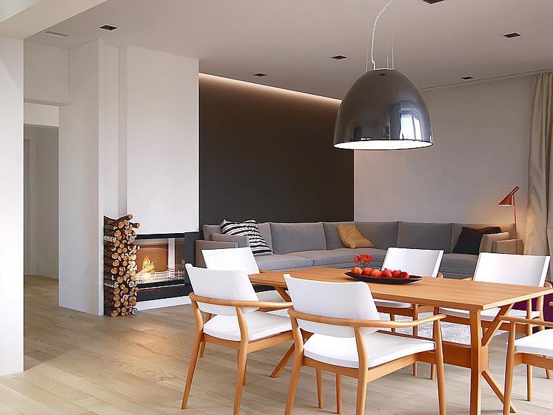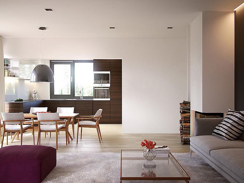 Гостиная и кухня разделены обеденной зоной – большим столом, где сможет собираться вся семья ? Такое зонирование делает интерьер более просторным. По желанию в гостиной можно установить камин, чтобы ваши вечера были ещё теплее и душевнее?