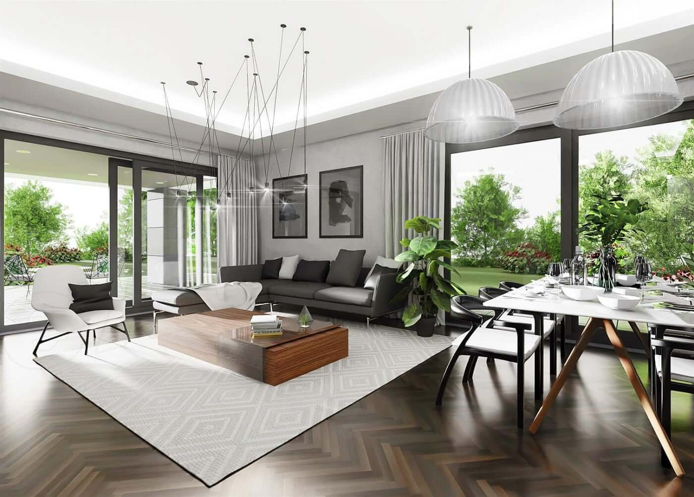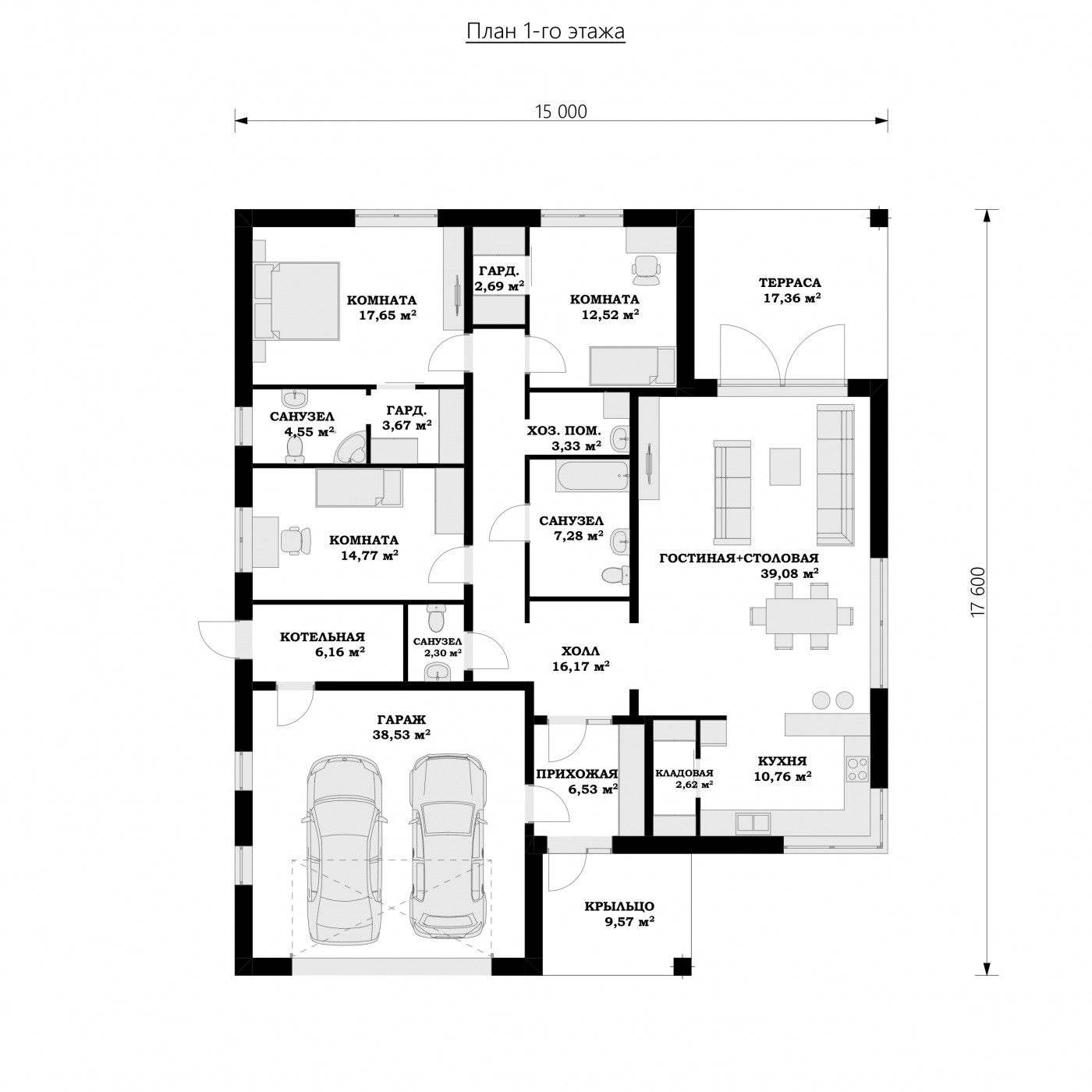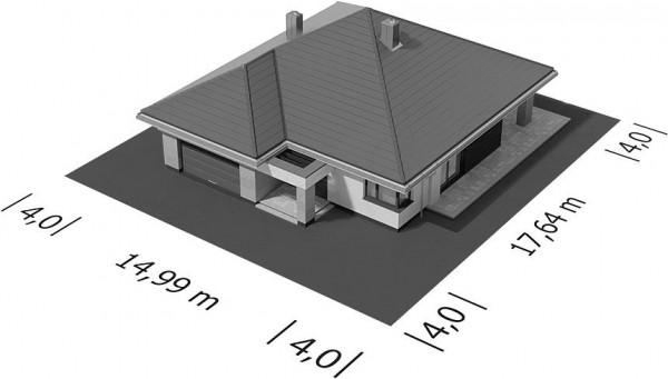 Современный, функциональный одноэтажный дом с двойным гаражом был спроектирован для семьи из четырех человек. Вход в дом, защищенный аркадой, ведет к прихожей с местом для гардероба. Жилая часть дома состоит из удобной кухни с окном с передней стороны дома и просторной гостиной со столовой и зоной отдыха. Широкие террасные двери оптически увеличивают гостиную и столовую. Терраса защищена большой аркадой, которая защищает от солнца и дождя. В гостиной камин может помочь обогреть ваш дом в холодное время года. Спальная зона была четко отделена от остальной части дома, чтобы обеспечить конфиденциальность. В этой части дома были спроектированы три комнаты, в том числе спальня с двуспальной кроватью с гардеробной и собственной ванной комнатой, а также две меньшие спальни. Рядом с ними большая общая ванная комната, прачечная,