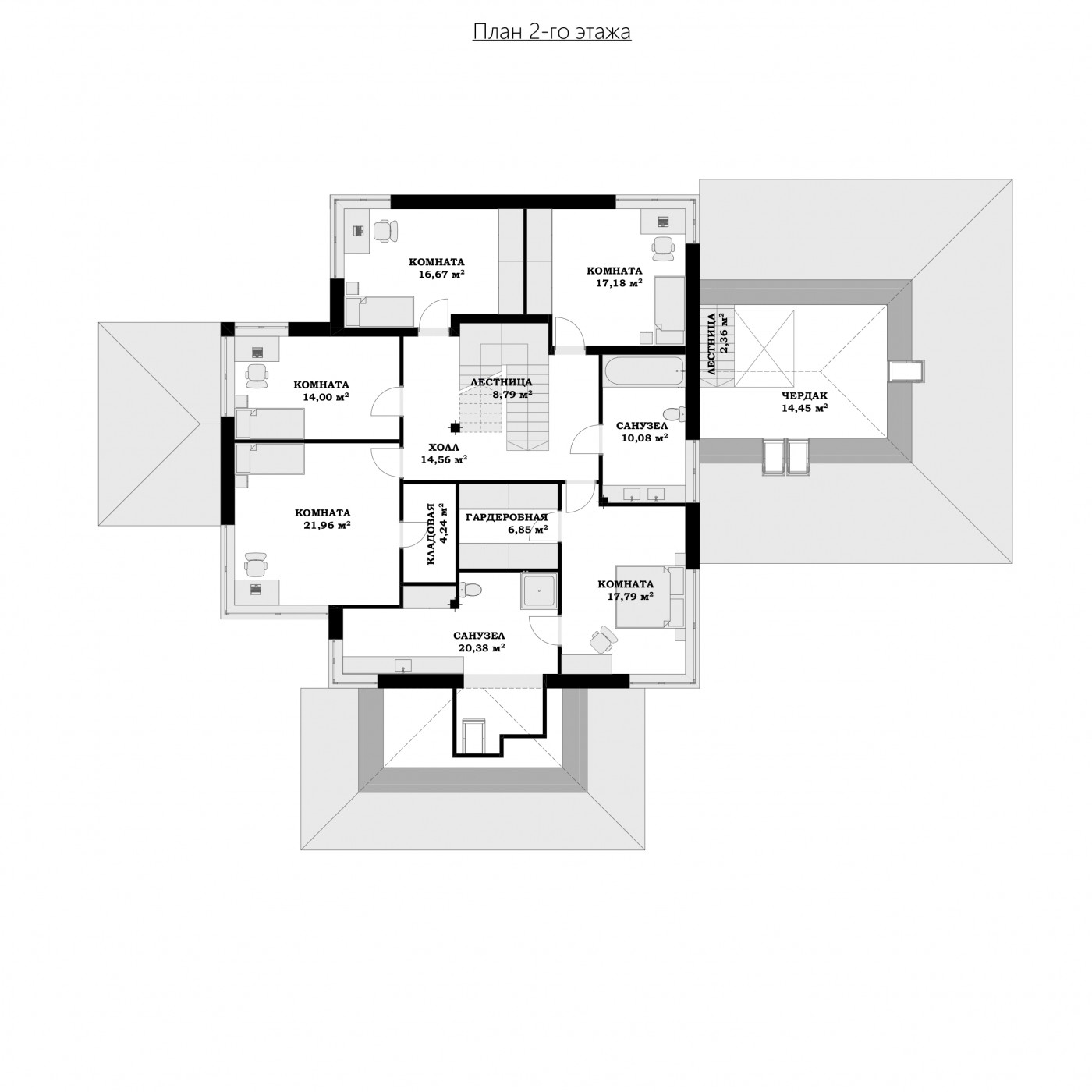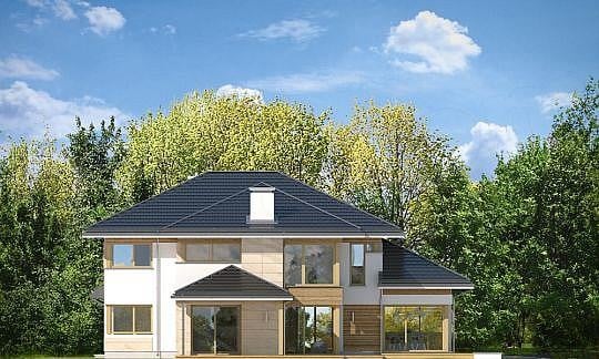 Мы входим в дом через широкую входную дверь с боковыми транцами прямо в красивый вестибюль с гардеробом. Прихожая соединяется с жилой зоной и подсобным помещением дома - с гаражом и большой комнатой за гаражом и кладовкой на чердаке. В жилой зоне у нас есть красивый интерьер объединенной гостиной, зала и столовой, а также кухня, частично скрытая за кладовой. Интерьер гостиной и столовой открыт с широким остеклением на частично крытую террасу и в сад. На первом этаже у нас есть дополнительный кабинет, ванная комната и котельная. На первом этаже, из-за ликвидации пустоты над гостиной, мы можем разместить до пяти спален. Здесь у нас есть квартира для родителей с собственной ванной комнатой и гардеробной, две детские спальни с ванными комнатами и две дополнительные комнаты - спальни или комнаты для любых других целей. Над полом находится большой чердак.