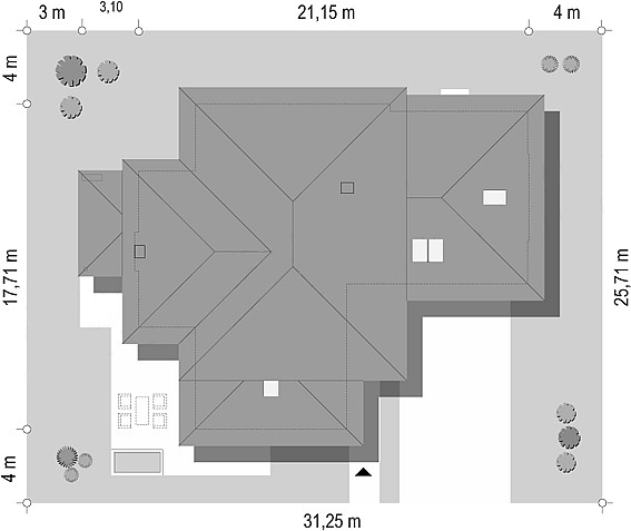Здание состоит из трех основных блоков: основного одноэтажного ядра, покрытого шатровой крышей, и двух добавленных к нему двухэтажных корпусов, покрытых трехскатной крышей. Современный внешний вид дома усиливается благодаря большому остеклению, фасадным перегородкам, а также каменной и деревянной облицовке. Дизайн будет идеально сочетаться как с городской средой, как городская вилла, так и в более свободных загородных или загородных постройках.