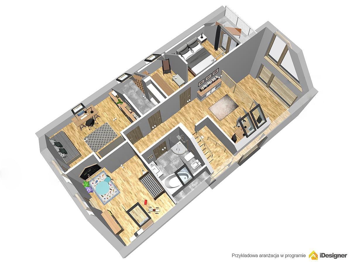 Как и полагается современным трендам и решениям при строительстве, в доме предусмотрена мансарда. Подобное решение позволяет создать обустроенное пространство, которое увеличивает визуально границы дома.