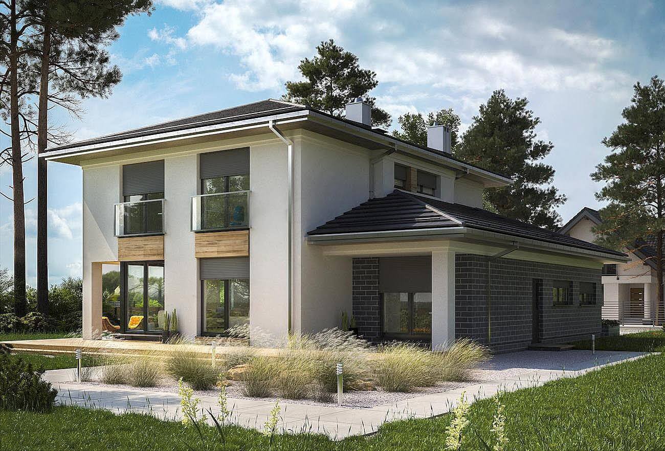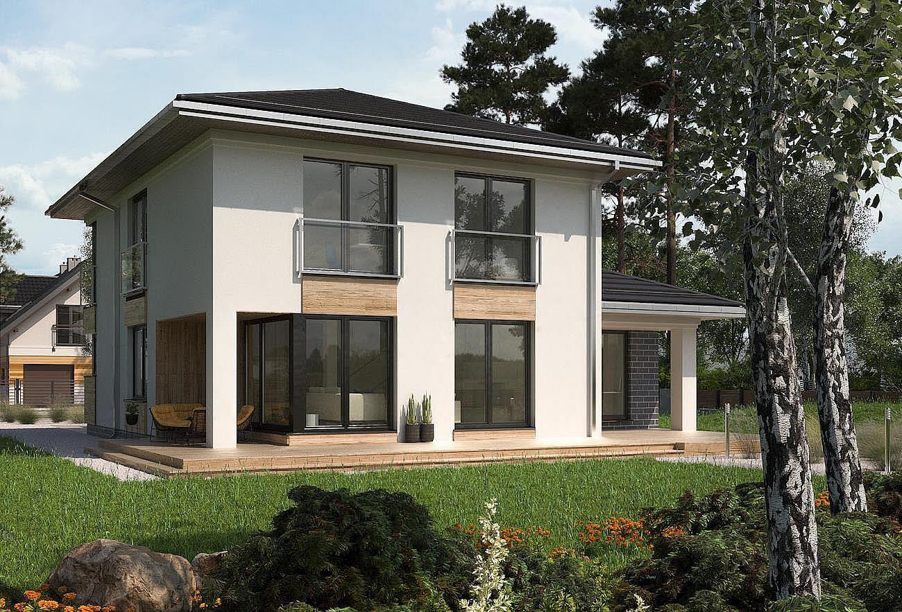 Дизайн дома "Оклахома", уникальный в предложении Рам Вилла, является двухэтажным зданием, с гаражом, и имеет современный, городской характер. Он предлагает большую, удобную квартиру с не очень крутыми шатровыми крышами над планом, построенным из перекрывающихся прямоугольников. Из него выходит прямоугольное двухэтажное здание, окруженное с одной стороны более низким зданием, выступающим вперед. Здесь находится гараж, котельная, а сзади - кабинет у гостиной. Кроме того, часть его крыши, поддерживаемая на шесте, покрыта входной террасой. За глубокой аркадой в алькове, холлом с выходом в гараж, а за холлом - просторная гостиная. Небольшой кабинет примыкает к саду, столовой и кухне с кладовой с фасада. Частично открытая лестница с кладовой ведет наверх в четыре комнаты. Существует также прачечная и набор из двух ванных комнат, одна из которых относится только к главной спальне. Большое остекление балкона, заключенное в вертикальные полосы на фасадах, угловые окна в дизайне дома «Оклахома» и садовые подрезанные террасы смягчают строгость блока. Общие габариты объекта чуть белее - 12 х 15 м.