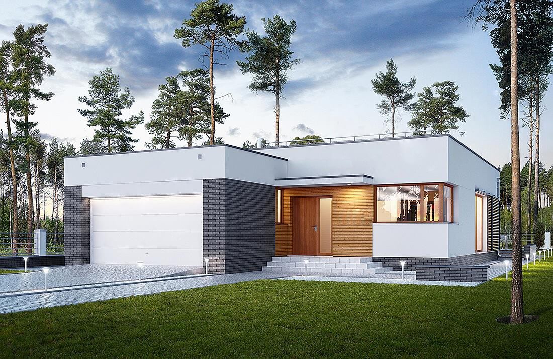 Дизайн дома "Даллас" является идеальным предложением для людей, которые имеют средне широкий участок. Дом с плоской крышей 19 на 12 имеет простой блок, поэтому его реализация не потребит слишком много финансовых ресурсов. Дом был спроектирован для отдельно стоящих зданий. Автор проекта включил двойной гараж форвардов. Конструкция дома покрыта плоской крышей, благодаря чему пол не имеет наклонов и поэтому полностью функционален. Проект "Даллас" - это одноэтажный дом, который делает общение между комнатами очень удобным. Автор проекта предвидел в нем интересную дневную зону. Открытая кухня - идеальное место для семейных и дружеских встреч. На кухне также есть стол, благодаря которому утренние встречи с семьей станут важной частью дня для каждого члена семьи. Дневная зона создается гостиной и столовой, что наверняка удовлетворит сторонников функциональных решений. Интересным элементом, безусловно, является камин, расположенный в гостиной, который придаст интерьеру неповторимую атмосферу. Спальная зона состоит из трех комнат, что является отличным вариантом для небольшой семьи. Пространство также может быть использовано в качестве комнаты для гостей или учебы. Для людей, которые ценят хорошую организацию, важной комнатой является гардероб, представленный в дизайне. Комфортное использование дома также зависит от подсобного помещения, включенного в него. Общие барбекю и семейные трапезы будут дополнены террасой, включенной в проект. Технология кирпича, рекомендованная архитектором, обеспечивает прочность и прочность конструкции. Его внешний вид усиливает характеристики современного стиля, который идеально подходит для людей, которые ценят новейшие решения.
