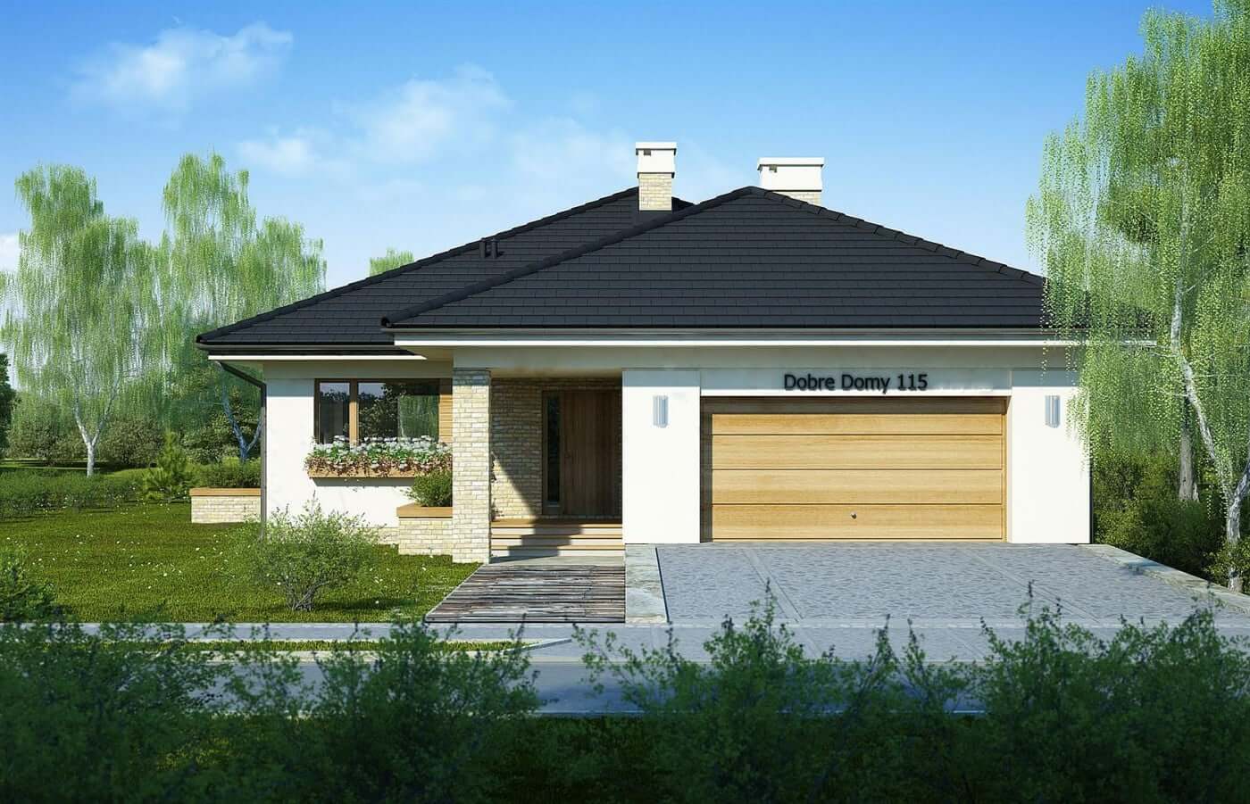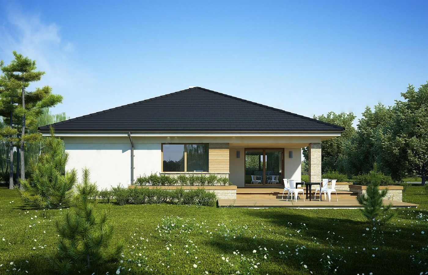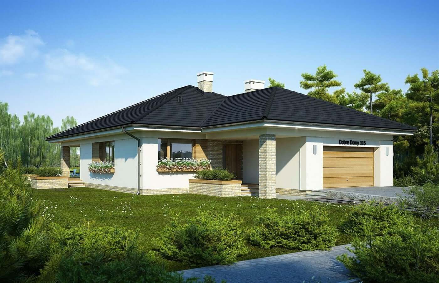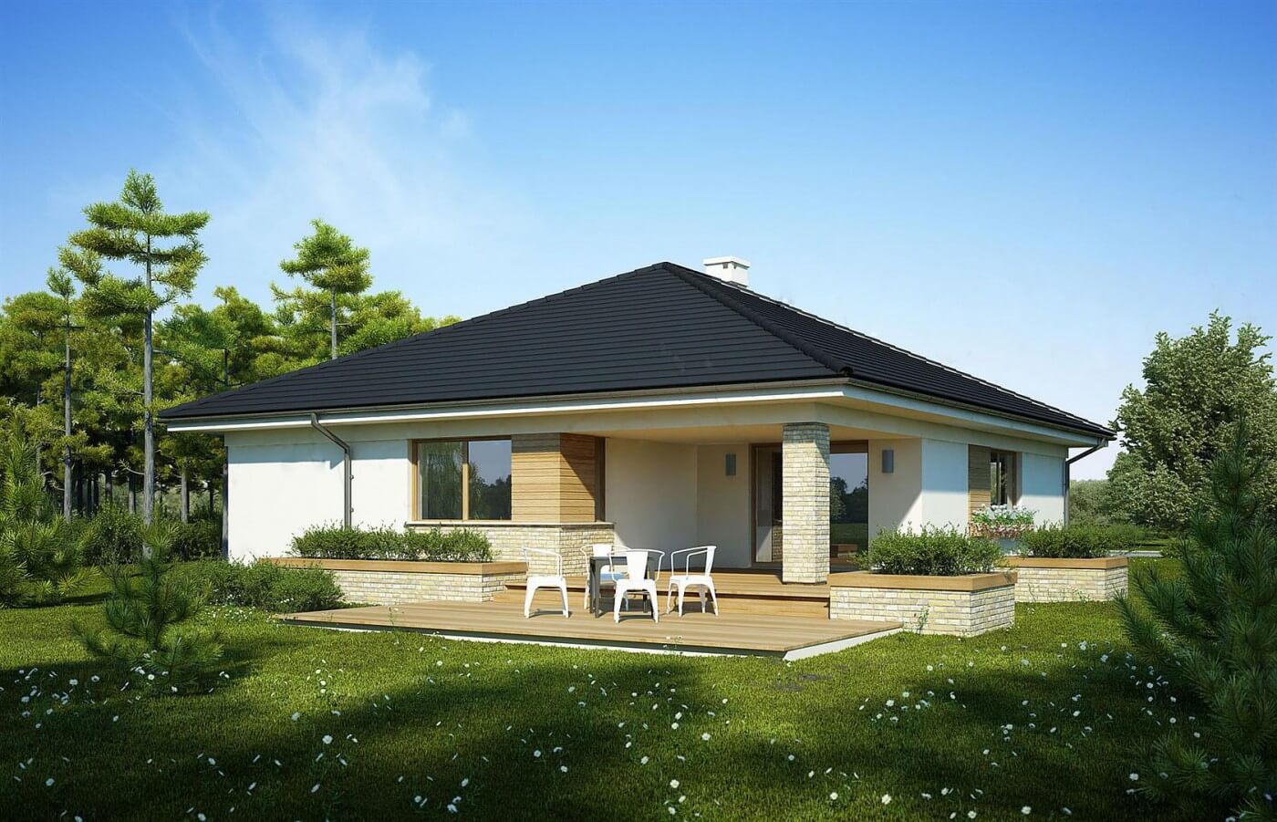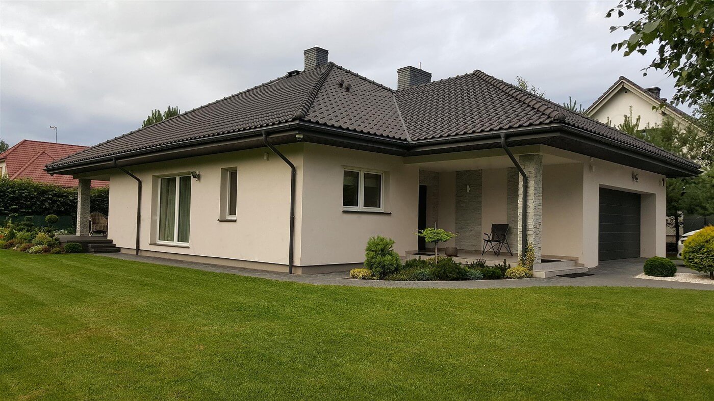 Просторный и комфортабельный интерьер одноэтажного дома "Сидней" был заключен в разложенный в современном стиле блок. Продолговатая форма здания, вызванная гаражом вперед, требует большего участка. Форма самого дома довольно классическая, потому что он покрыт конвертовой крышей, но клинкер и деревянные акценты на фасаде придают ему современную эстетику. Гостиная была полностью открыта для зала, усиливая ощущение простора в интерьере. В углу запланирован камин, гарантирующий уникальность места, рядом с ним предлагается столовая. Гостиная выходит на многоуровневую террасу, прекрасно дополняющую форму дома, и благодаря частичной кровле, позволяющей отдыхать даже в непогоду. Рядом находится кухня с небольшой, но удобной кладовой. коридор, там, где расположена спальня, она начинается с ванной комнаты, специально расположенной в коридоре, чтобы гости могли иметь к ней свободный доступ. Далее три спальни, в том числе одна с гардеробной и ванной комнатой. Сам коридор между комнатами достаточно широк, чтобы легко поместиться в большой встроенный шкаф, компенсируя отсутствие гардероба. Просто пройдите через тамбур, чтобы быстро и комфортно добраться до подсобного помещения, где запланировано место для двух автомобилей и отдельное подсобное помещение. Элегантно представленный дом Bianka привлекает не только привлекательным фасадом, но, прежде всего, ярким и просторным интерьером, который отвечает даже высоким требованиям жителей. Одним из преимуществ является идеальное расположение спальни вдали от гостиной, чтобы отделить отдых от повседневной деятельности.