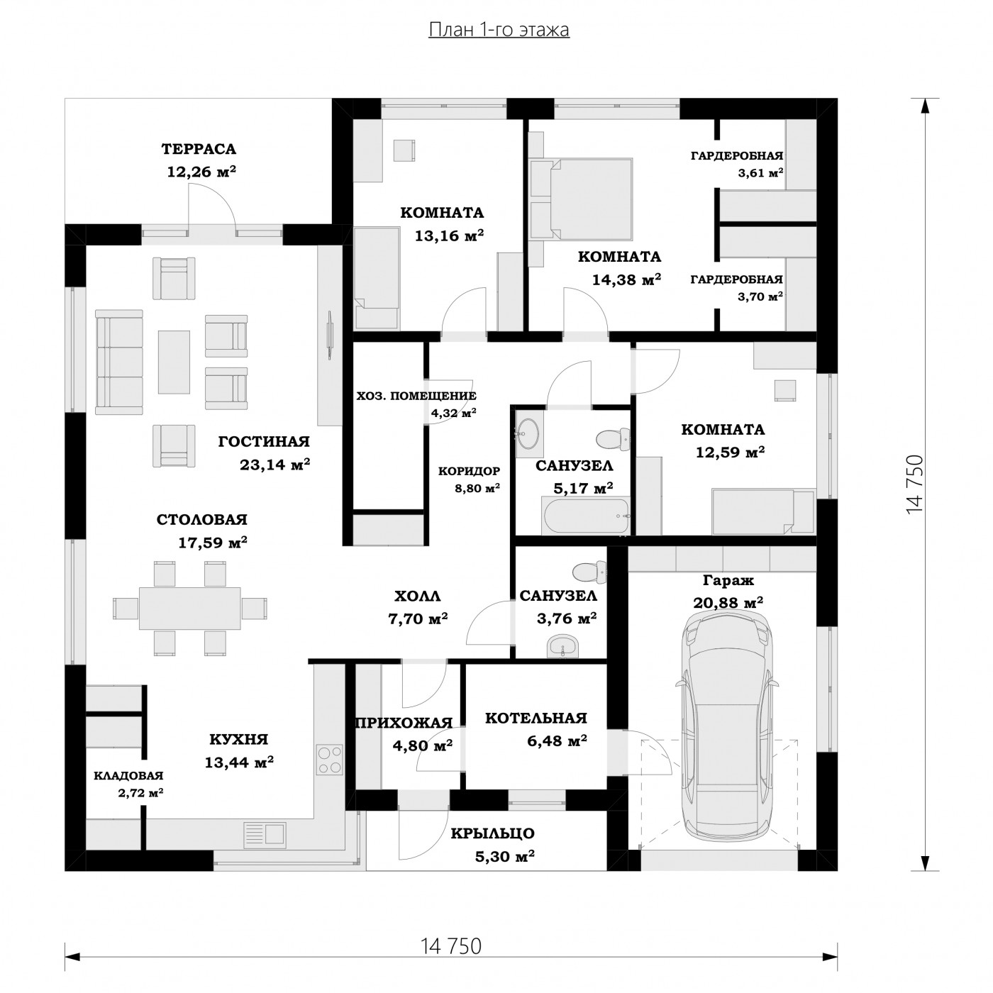 На данной странице Вы можете найти наши проекты домов 14 на 14 под ключ с гаражом в различных исполнениях, но чаще всего – это внутреннее парковочное место, гараж «встроенный» в дом. Это наиболее популярное и практичное решение для современных проектов. Такого рода парковочное место подходит как для проектов одноэтажных домов с гаражом, так и для более массивных построек. Подобного рода решения создают более комфортные условия посадки и высадки из автомобиля, а также, создают более безопасное стояночное место на самом участке.